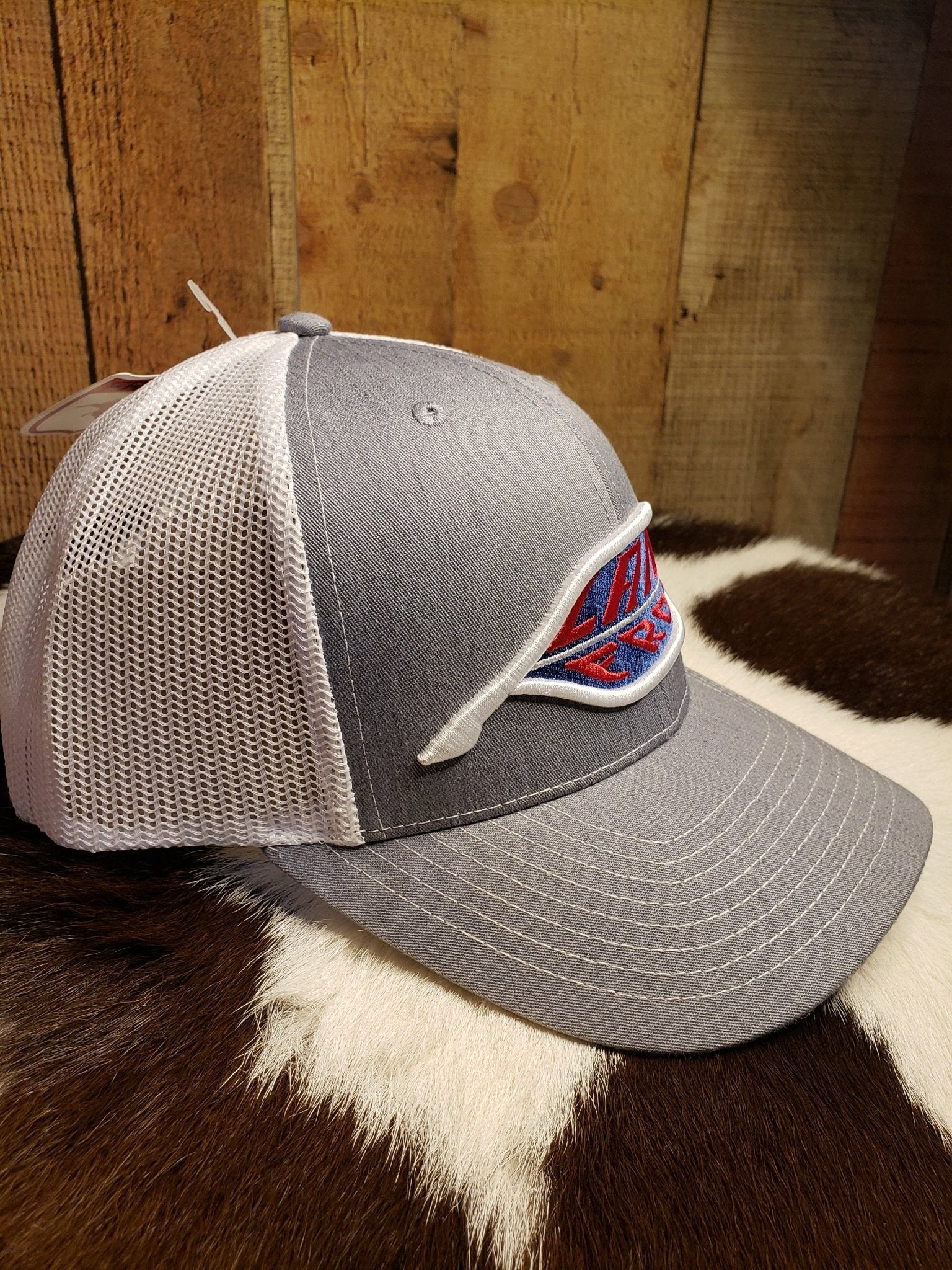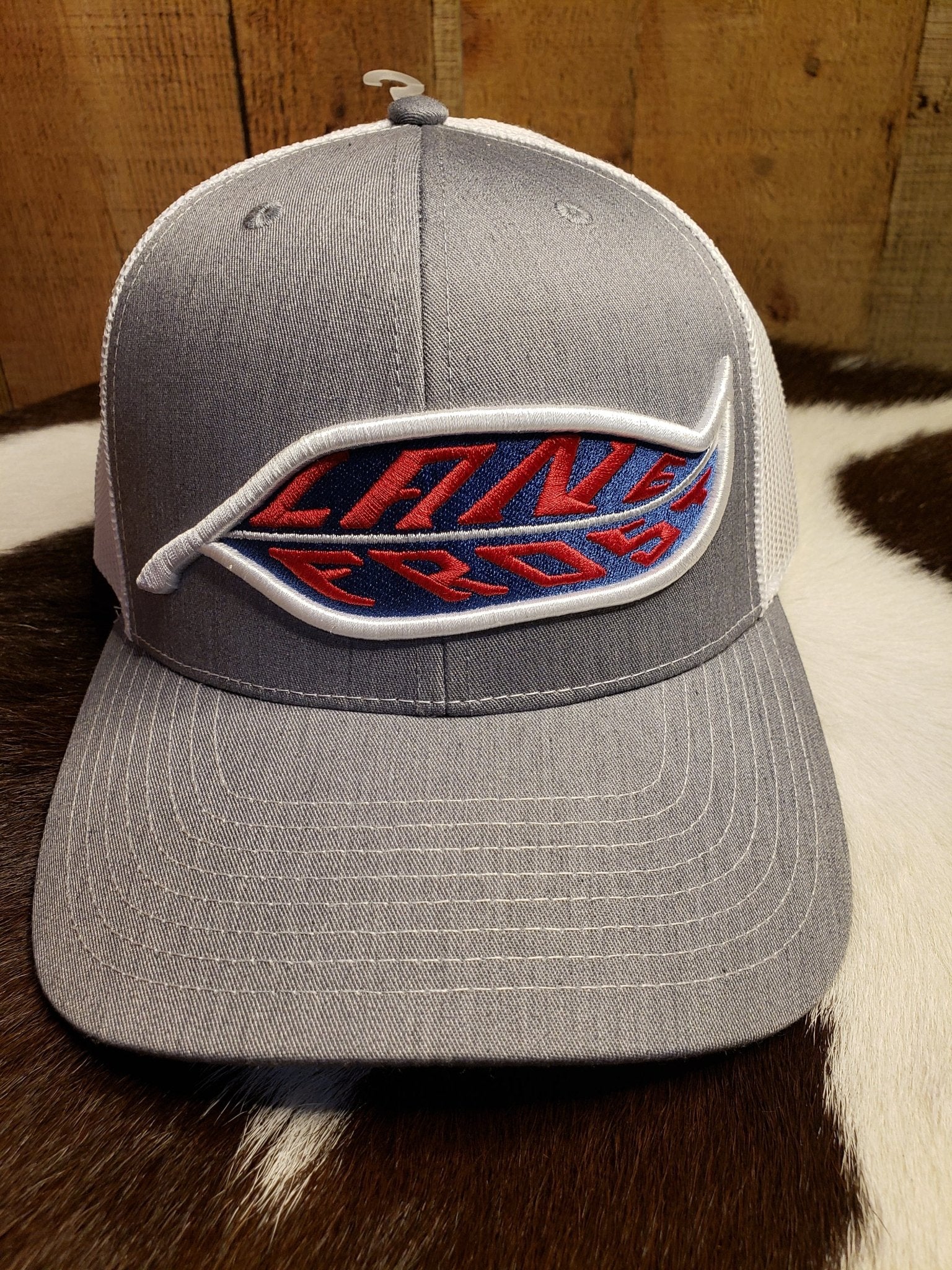 This Lane Frost cap features a grey front with a white, red and blue "Lane Frost" feather embroidery. White mesh back, flat grey bill and snapback.