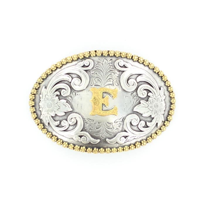 Gold “E” Silver Floral Etching Oval Buckle