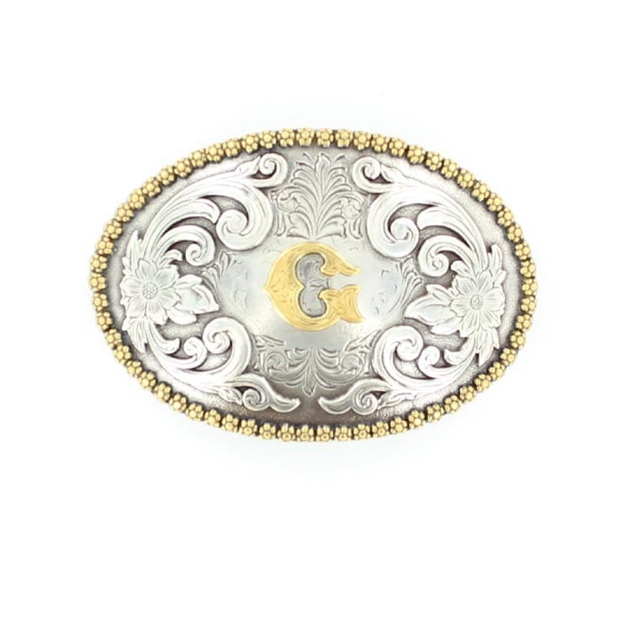 This is a gorgeous silver Nocona buckle by M&F Western Products. It features an antique finish background with scrolling, and the letter of your choice in the middle.  This buckle is ideal for a personalized gift.  Measures 2-3/4” x 4”.