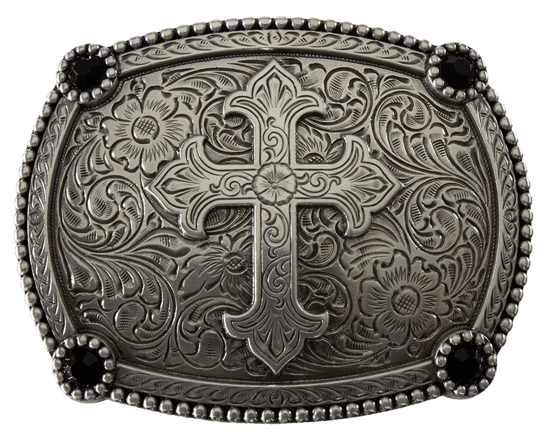 Add a touch of faith and Western style to your outfit with the Blazin Roxx Floral Cross Western Belt Buckle by M&F Western Products. This beautifully detailed rectangular buckle features a raised floral cross centerpiece surrounded by intricate engraved scrollwork.