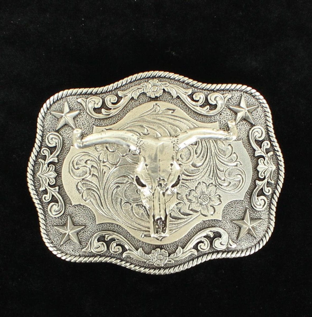 Make a bold western statement with this classic buckle. Featuring a detailed scrolling background and a striking steer skull motif in the center, this piece captures the rugged spirit of the American West. The design is framed with a traditional rope edge, giving it an authentic cowboy finish. Built for durability and style, this buckle is the perfect accessory for rodeo nights, ranch work, or everyday wear.
