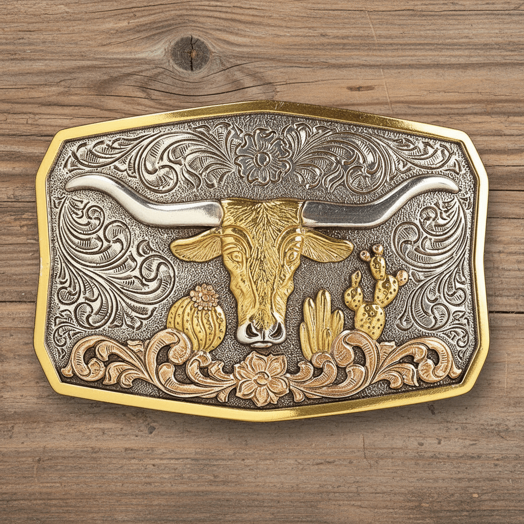Keywords: Nocona buckle, longhorn buckle, cactus Western buckle, antique gold and silver buckle, 37910, men’s cowboy belt buckle, Western rope-edge buckle