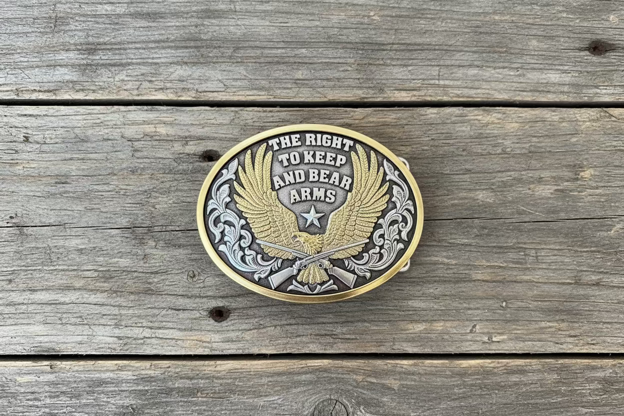 The raised lettering reading “The Right to Keep and Bear Arms” stands out against the textured background, while the oval shape and gold-tone edge add classic western contrast. Crafted with a silver-tone base and dimensional detailing, this buckle is designed to make an impact whether worn daily or saved for special occasions.