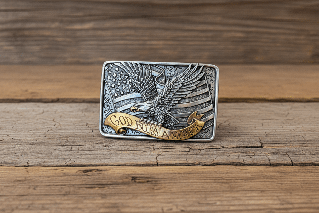 Finished with a contrasting gold-tone “God Bless America” banner, this rectangular buckle adds depth and visual impact while honoring classic American values. The silver-tone base and raised detailing give it a timeless western look that pairs perfectly with denim, boots, and everyday wear.