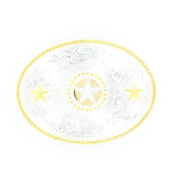 Add a bold and patriotic touch to your Western gear with the Nocona Men’s Star Belt Buckle by M&F Western Products®. This eye-catching oval buckle features a shiny silver finish with a high-polish gold-tone rope edge, and a star cut-out motif that includes two raised gold stars on each side for standout style.