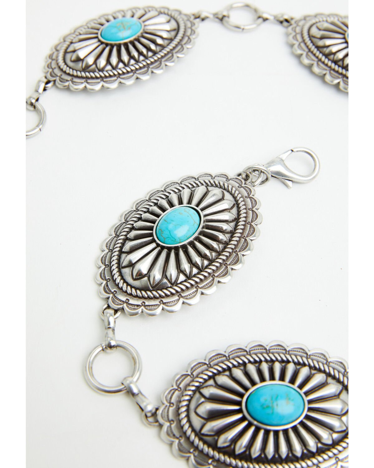 Make a bold western statement with the Ariat Women’s Turquoise Concho Chain Belt — a stunning blend of vintage charm and modern cowgirl flair. This eye-catching accessory features silver-tone chain links adorned with ornate turquoise conchos, designed to add a pop of color and western style to any outfit.