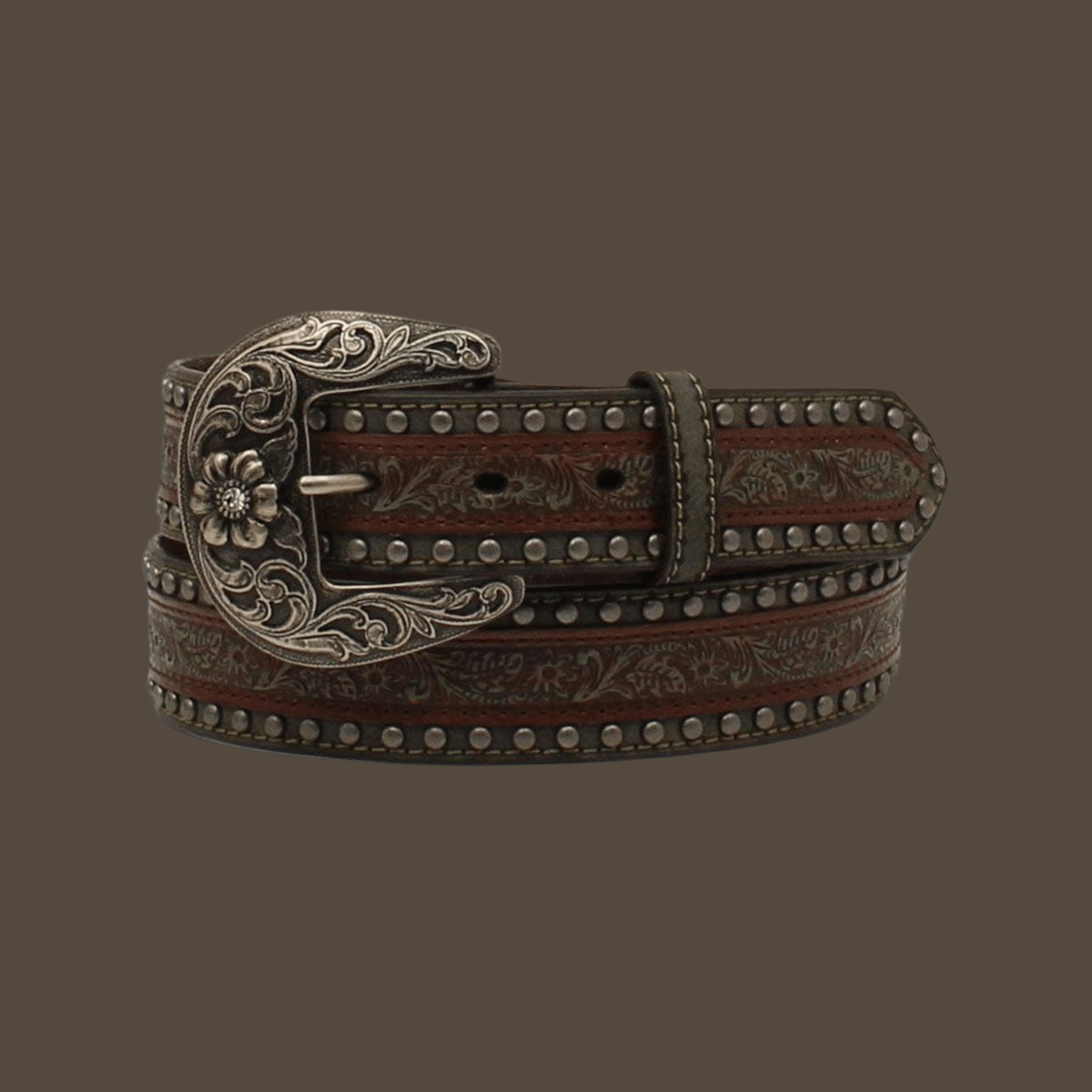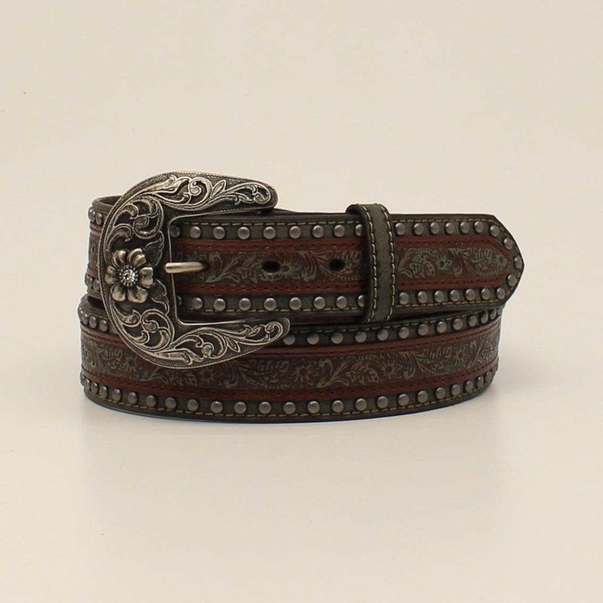 Add classic Western charm to your wardrobe with the Nocona Ladies Floral Embossed Belt (N320003702). Crafted from genuine brown leather, this women’s belt showcases a beautifully embossed floral overlay strip accented with antique silver studs along the edges. The stylish design makes it perfect for both everyday wear and dressing up your favorite jeans or Western outfit.
