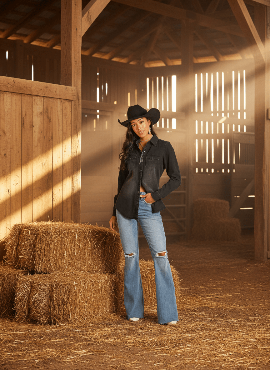 Whether you’re pairing it with jeans for a classic denim-on-denim outfit or layering it over a graphic tee for a casual vibe, this shirt transitions seamlessly from the ranch to a night out. Detailed with pearl snap buttons, double chest pockets, and Western stitching, it’s a versatile essential for every modern cowgirl.