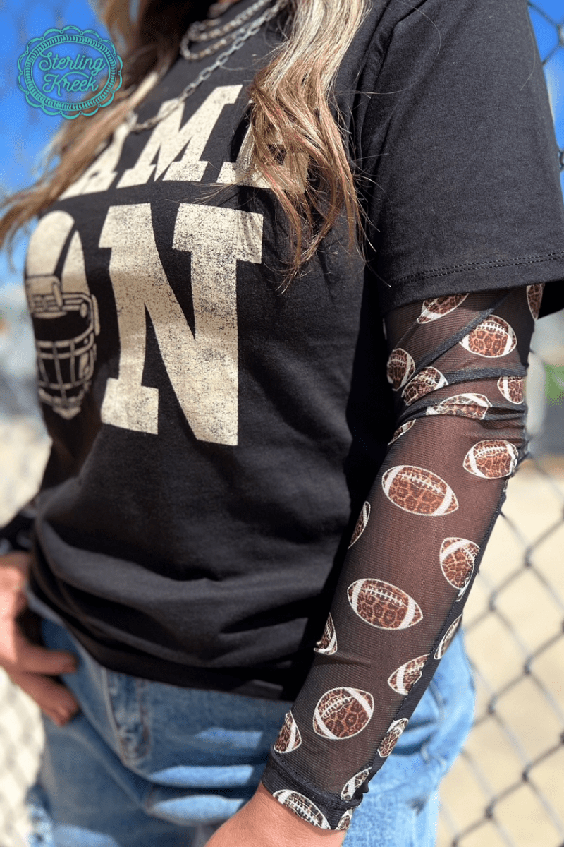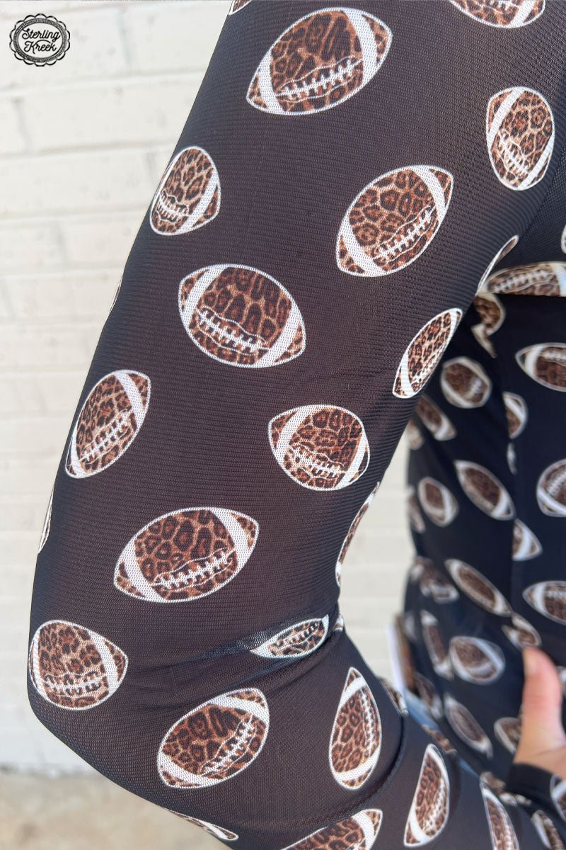 Turn heads this season in the Sterling Kreek Girls of Fall Mesh Top – the ultimate statement piece for fall fashion lovers! This bold and playful top features a unique design of cheetah print footballs, blending fierce style with your love for game day. Made from breathable, sheer mesh fabric, it’s perfect for layering or wearing on its own for a standout look.