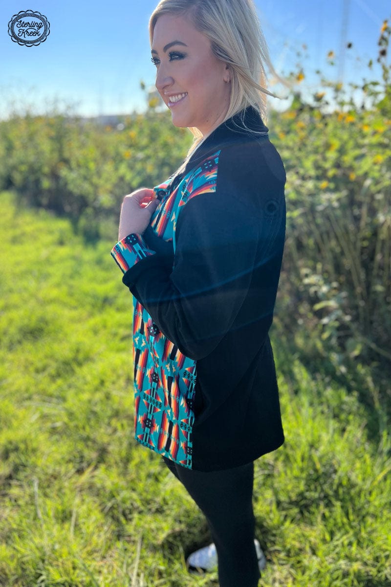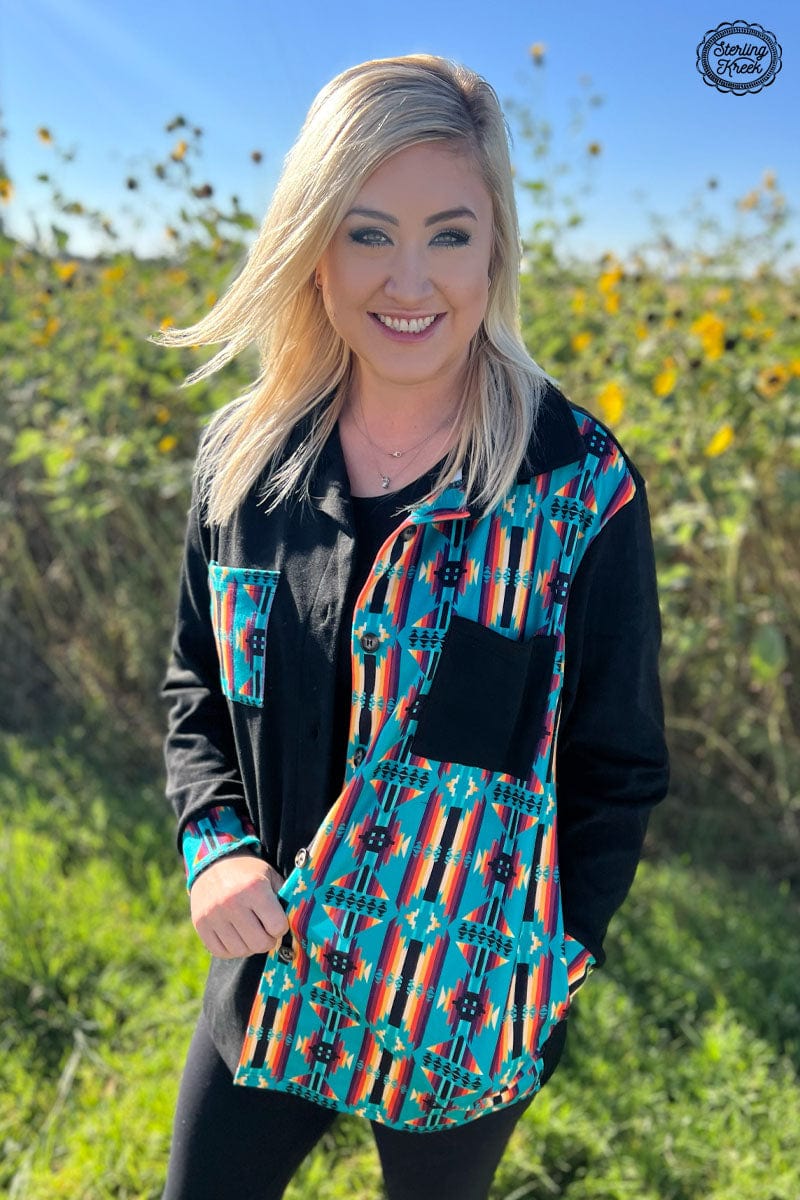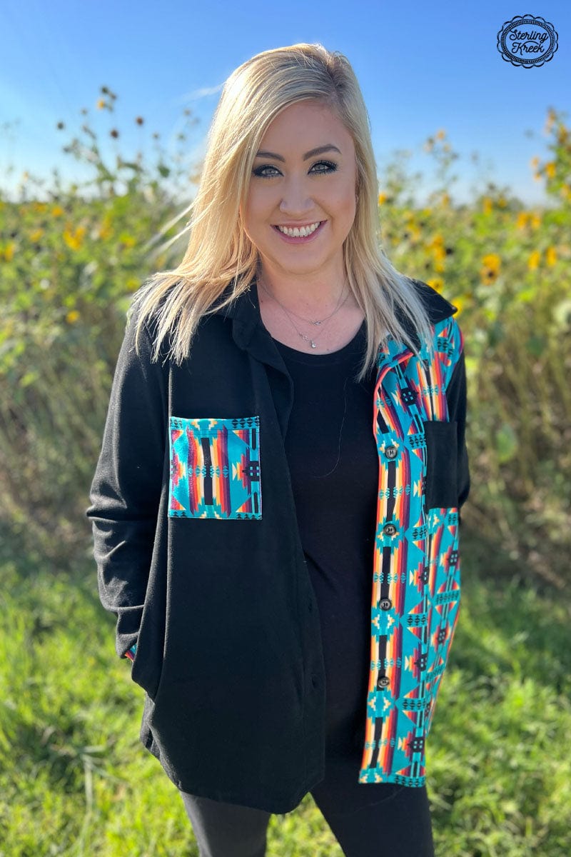 The Sterling Kreek One and Only Shacket is a versatile and stylish garment, combining both a classic black design and a wild western aztec print. As the name suggests, it is the only shacket you will ever need, making it a convenient and practical addition to any wardrobe. Embrace the spirit of the wild west without ever having to leave the comfort of your home with our unique shacket.