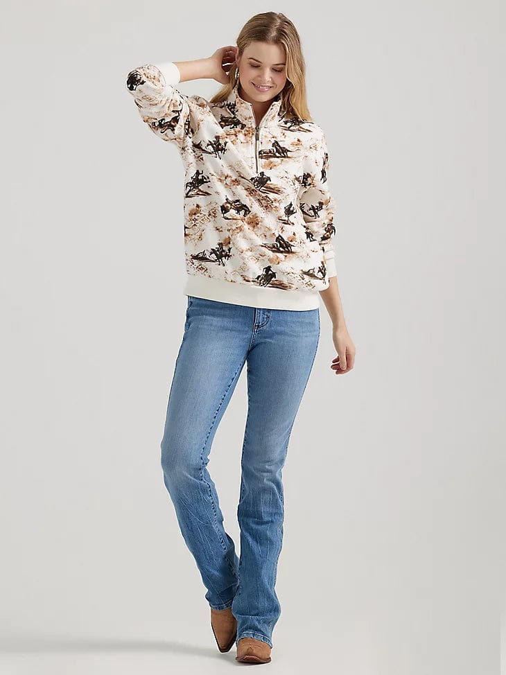 Live boldly but keep cozy in the Women’s Wrangler Retro® Bold Bucking Quarter Zip Sweatshirt. This winter staple is crafted from cotton and fleece to warm you up. It features a regular fit with dropped shoulders, a slightly cropped cut, and partial zip neck. It also comes covered in a retro-inspired print full of cowboys riding and roping at full speed.
