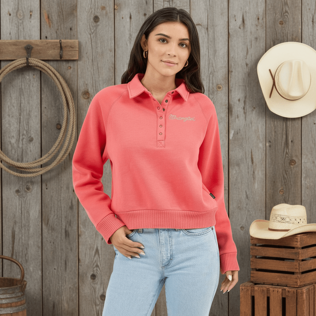 Perfect for transitional weather and year-round layering, this Wrangler women’s pink pullover delivers a timeless look with everyday comfort.