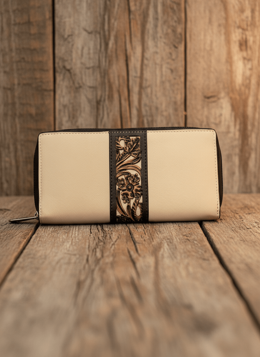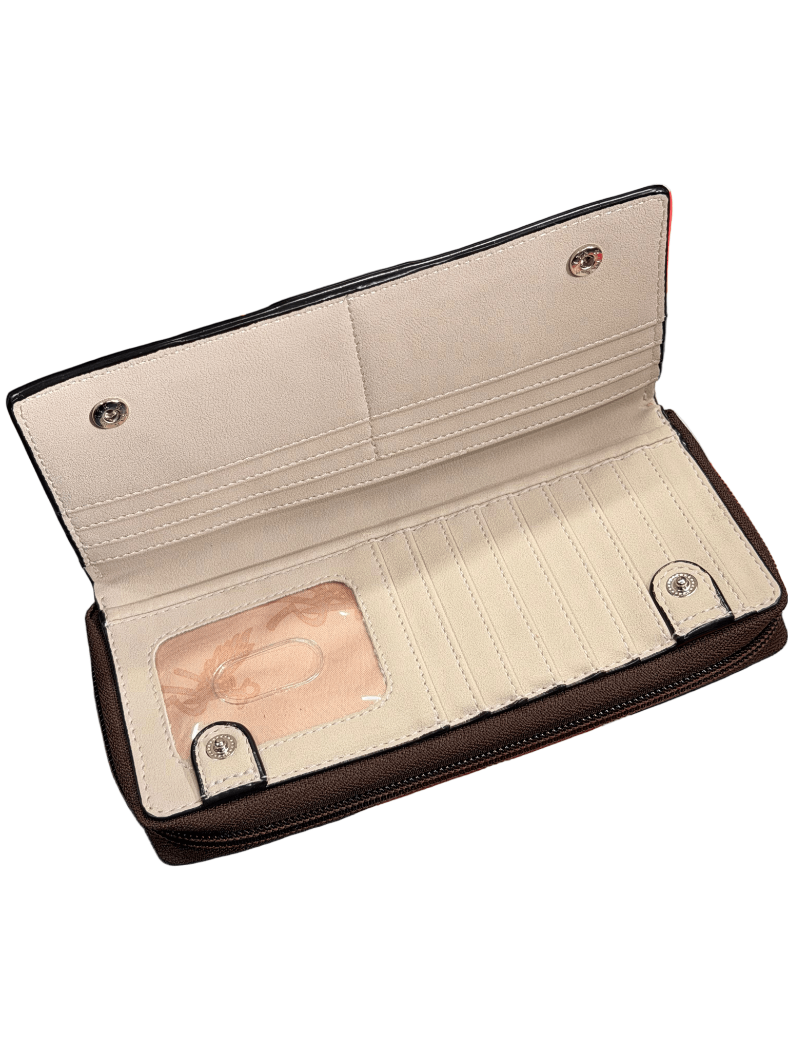 Elevate your western carry with this stylish and functional wallet from Angel Ranch’s Opal Collection. Subtle ivory tones pair beautifully with a genuine leather floral filigree overlay, giving you bold ranch-chic appeal wherever you’re headed. The 7½″ × 4½″ design opens to a thoughtfully organized interior—multi cash and card slots, a clear ID window, and one large zippered change compartment with a center divider for coins or smaller items. A back exterior zip pocket offers quick access to receipts or change. Crafted of approx. 80% PU (polyurethane), 15% polyester and 5% genuine leather, this wallet delivers both durability and western flair. Style it with your favorite boots, handbag or show outfit for a finish that’s as practical as it is polished.