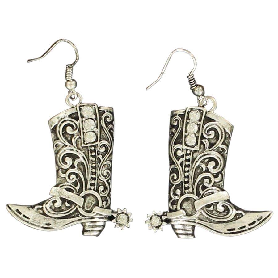 Show off your western style with these Blazin Roxx Cowboy Boot Earrings. Designed in antiqued silver, each boot features a swirl pattern with tiny spurs and sparkling crystal accents for just the right touch of shine. The lightweight French wire dangle hooks make them comfortable to wear all day—perfect for rodeos, nights out, or adding a little cowgirl flair to your everyday outfit.