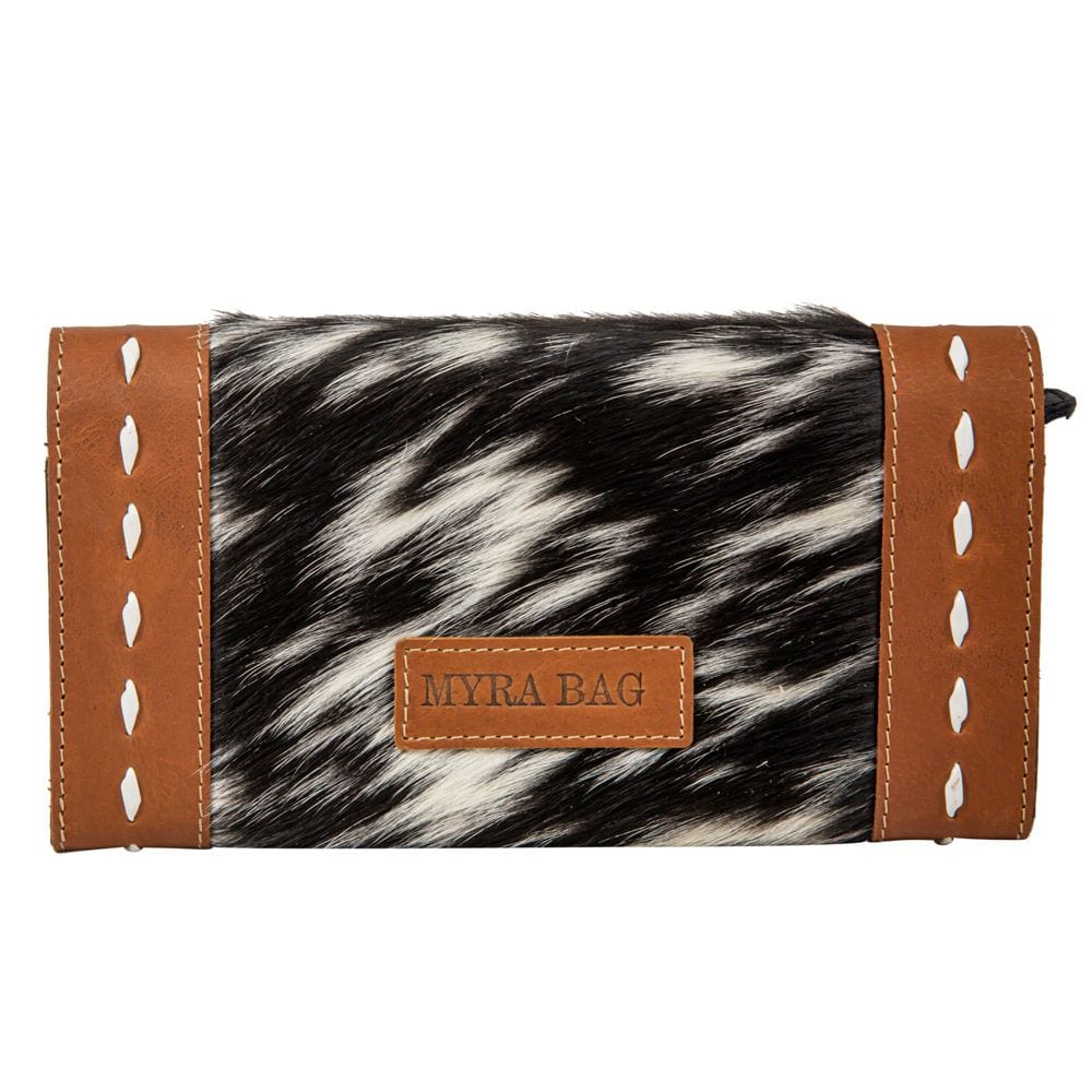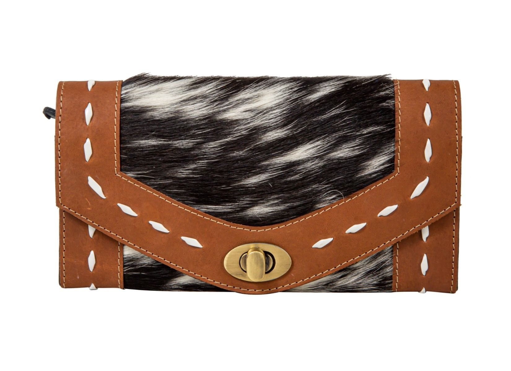 The delightful wallet has the unique styling that’s part of our Oxbow Falls collection. Warm caramel leather with special stitching frames the hair-on hide flap, which features a lock button closure. The interior features plenty of room for cards, IDs, and other other important items. A great addition to any collection!