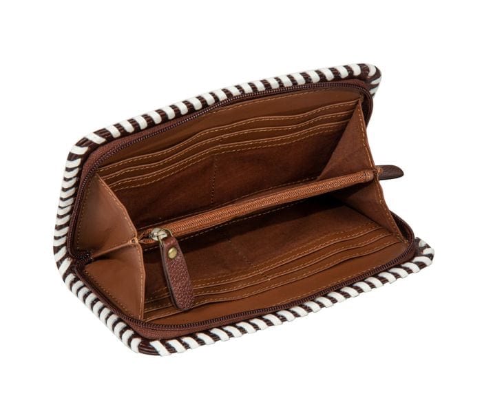 Radiate Western charm with the Myra Sunshine Loom Wallet, a captivating piece that blends artisan craftsmanship with cheerful style. The edge-stitched patterned leather pairs beautifully with woven upcycled rug side panels, creating a warm, sunny look inspired by traditional loom work. Every wallet is a unique expression of texture, color, and craftsmanship.