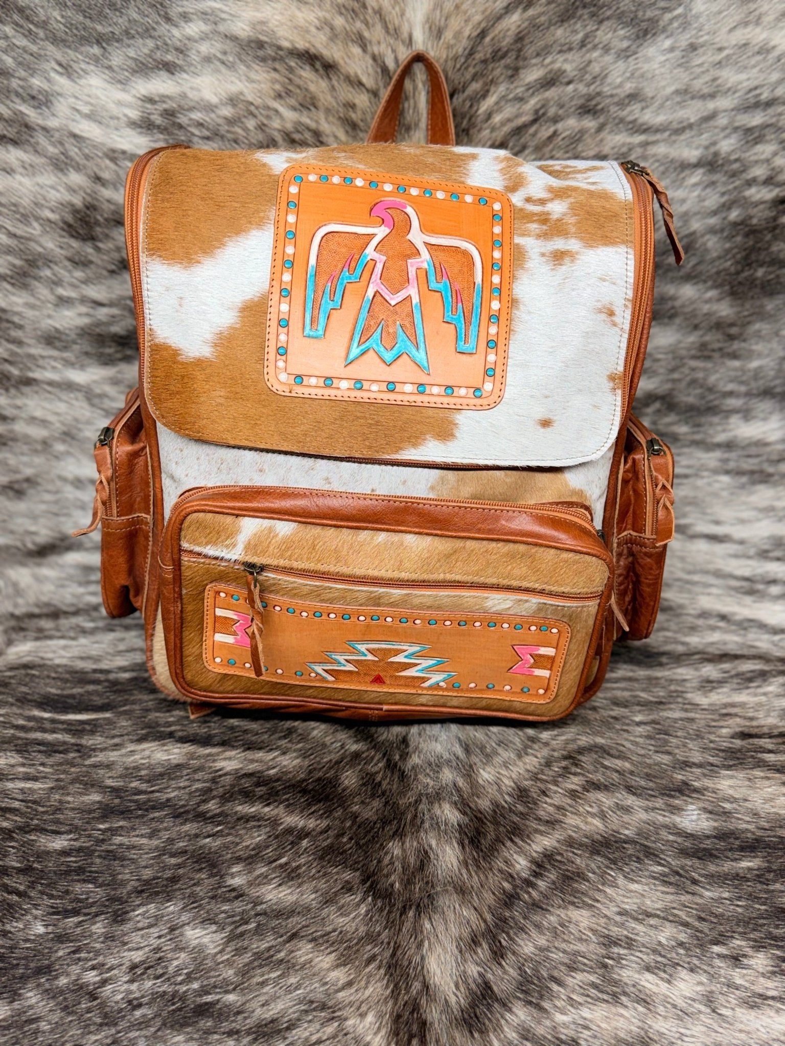 The Western Pink and Turquoise Free Bird Tooled Cowhide Backpack is where bold color meets authentic craftsmanship. Handcrafted from genuine white and tan hair-on cowhide and accented with intricately tooled leather in pink and turquoise, this backpack captures the spirit of Western artistry in every detail.