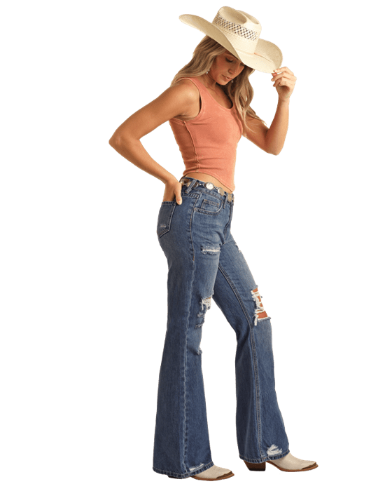 These Rock & Roll women's jeans offer comfort and style with their relaxed flare design and medium wash. The unique addition of tears adds a touch of edginess to this super cute pair. Perfect for a statement look that is both trendy and comfortable.