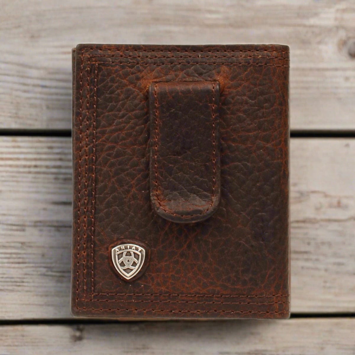 Carry western style and function with the Ariat Bi-Fold Money Clip Wallet by M&F Western Products®. Crafted from oil tan genuine leather, this wallet features a bold Ariat brand concho on the exterior along with a convenient external money clip for quick access to cash. Inside, the compact bi-fold layout includes multi-colored card slots, a clear ID window, and money compartments, blending rugged design with everyday practicality.