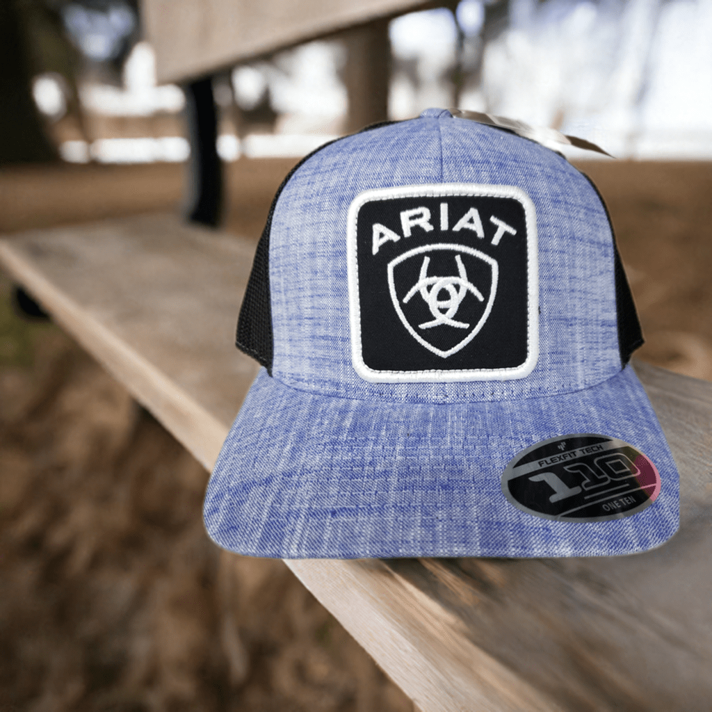 This snapback cap from Ariat features a blue denim front and black mesh with a square Ariat logo patch up front.