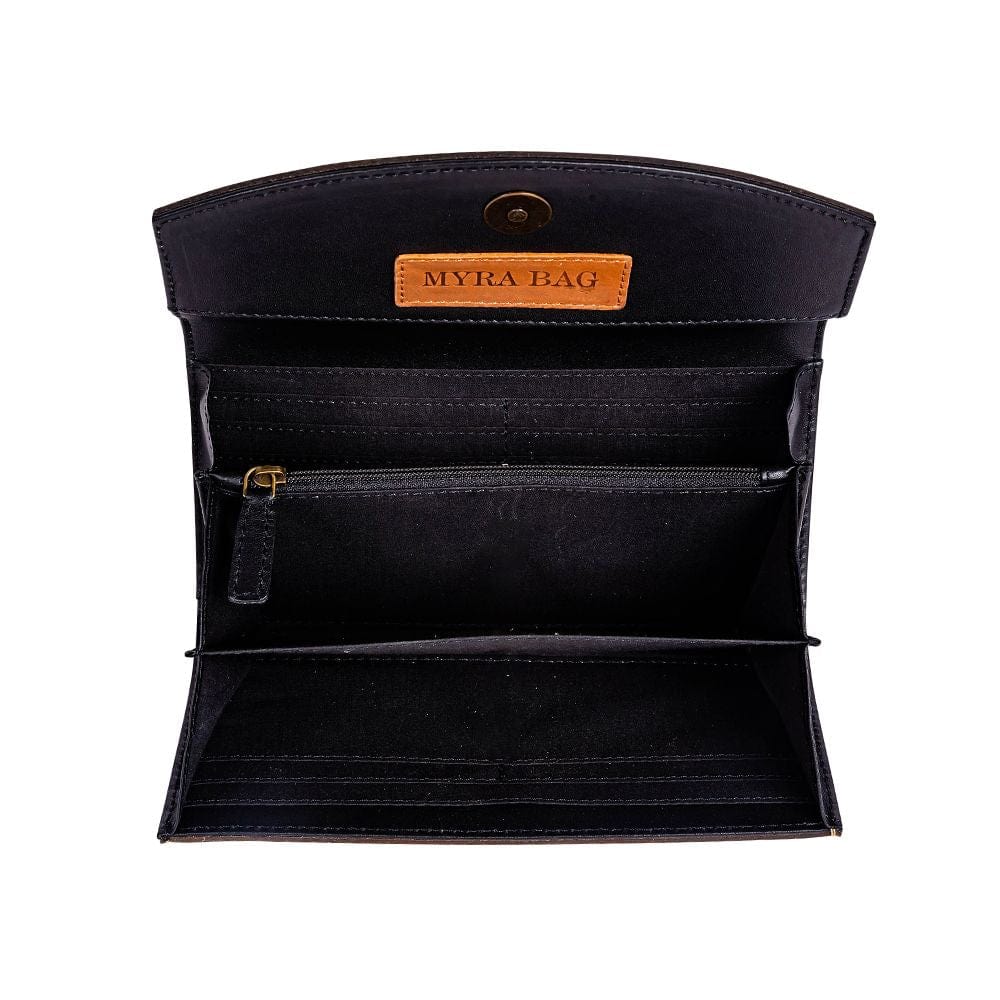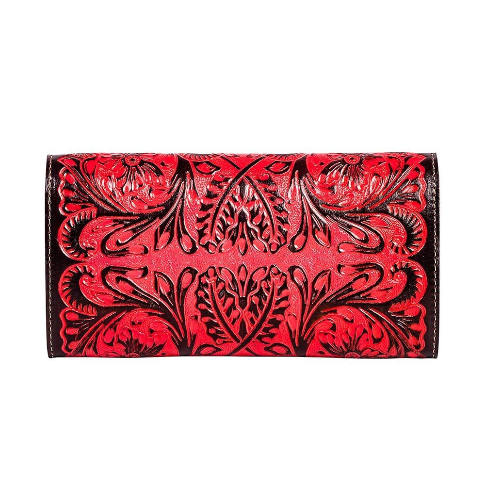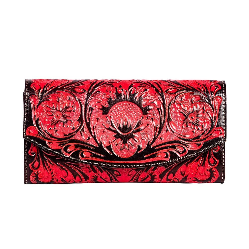 This amazing wallet features unique hand-tooled leather depicting blooms against an amazing red and black background. The interior features spacious sections, including a zippered pocket. Snap-close front flap. An incredible wallet for your collection!
