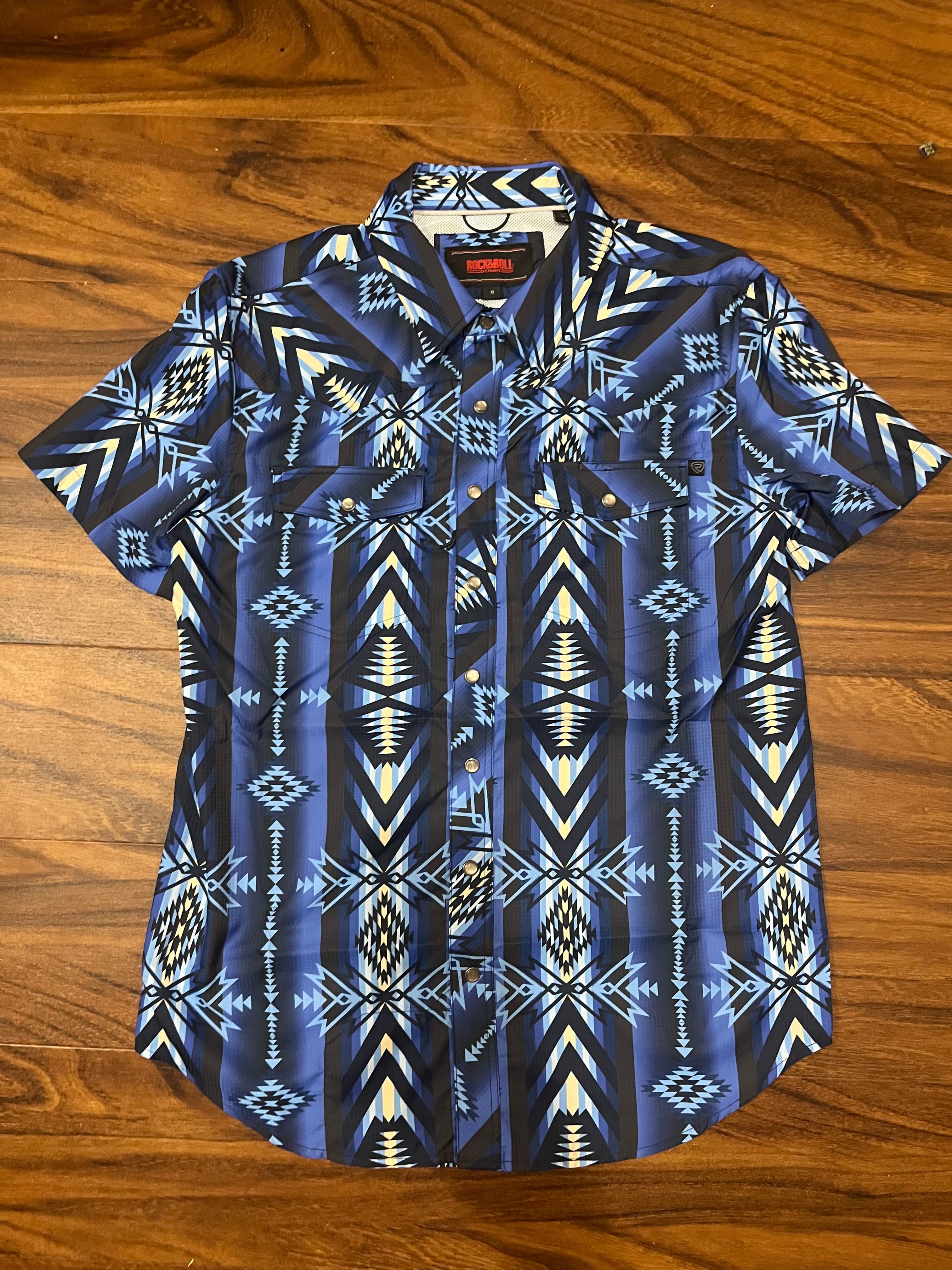 Expertly crafted with a blue Aztec print, the Rock & Roll Men's Tek Short Sleeve Snap Shirt is a stylish choice for any occasion. Made with quality materials, this shirt offers both comfort and durability. Perfect for any modern man looking to make a statement.