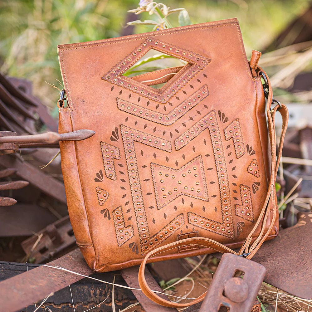 The Wayfarer is made with full grain, veg-tanned leather. Aztec pattern leather cutouts accent each piece with a unique pattern.